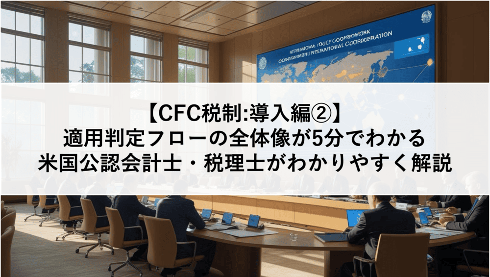 前回の「【導入編①】CFC税制の全体像が5分でわかる|米国公認会計士・税理士がやさしく解説」では、CFC税制(外国子会社合算税制)が海外の子会社を利用した租税回避を防ぐための制度であり、その適用判定にはいくつかのステップがあることをお話しました。今回はその具体的な適用判定ステップについて、一歩踏み込んで具体的に解説します。